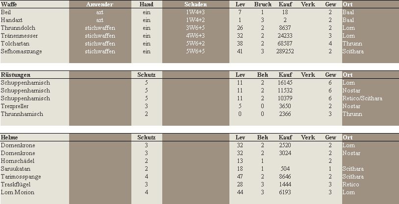 Liste der Waffen, Rüstungen und Helme